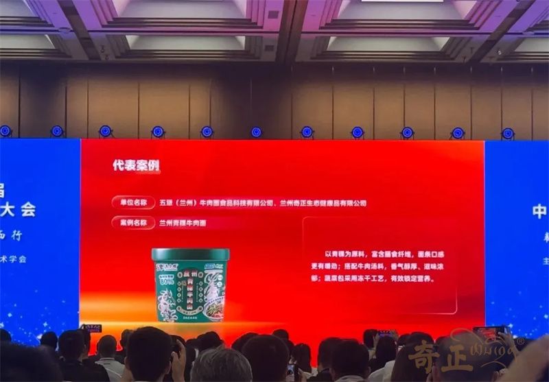 在大會(huì )代表案例展示中,由奇正生態(tài)健康品有限公司生產(chǎn)的蘭州青稞牛肉面榮登“2024—2025年度中國方便食品行業(yè)科技與產(chǎn)業(yè)創(chuàng )新新趨勢代表案例”,該產(chǎn)品以青稞為原料,富含膳食纖維,面條口感更有嚼勁;搭配牛肉湯料,香氣醇厚、滋味濃郁;蔬菜包采用凍干工藝,有效鎖定營(yíng)養。和傳統牛肉面相比,青稞牛肉面中青稞含量高達80%,膳食纖維和β- 葡聚糖含量更高,且青稞面餅非油炸,相對更健康。